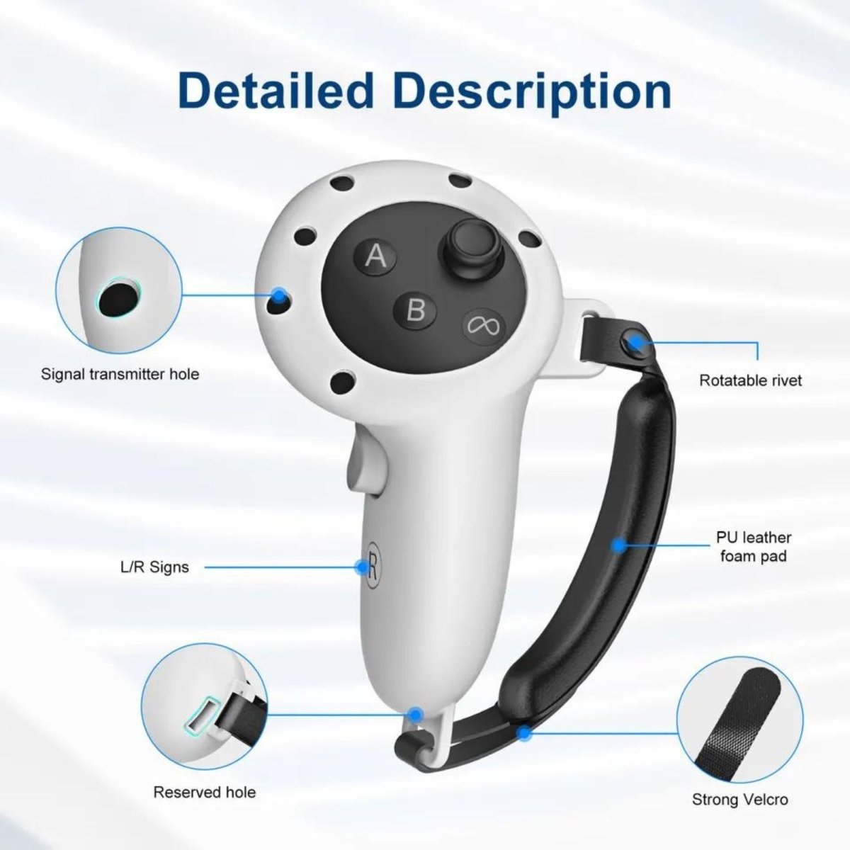 Deksel laget av silikon av høy kvalitet til Meta Quest 3-brillene for å beskytte kontrollerne mot støt og fall, noe som dessverre ofte skjer når du spiller spill fra Meta Quest-verdenen, SteamVR osv. I tillegg har dekslene justerbare stropper slik at du kan plassere kontrolleren perfekt i begge hender.