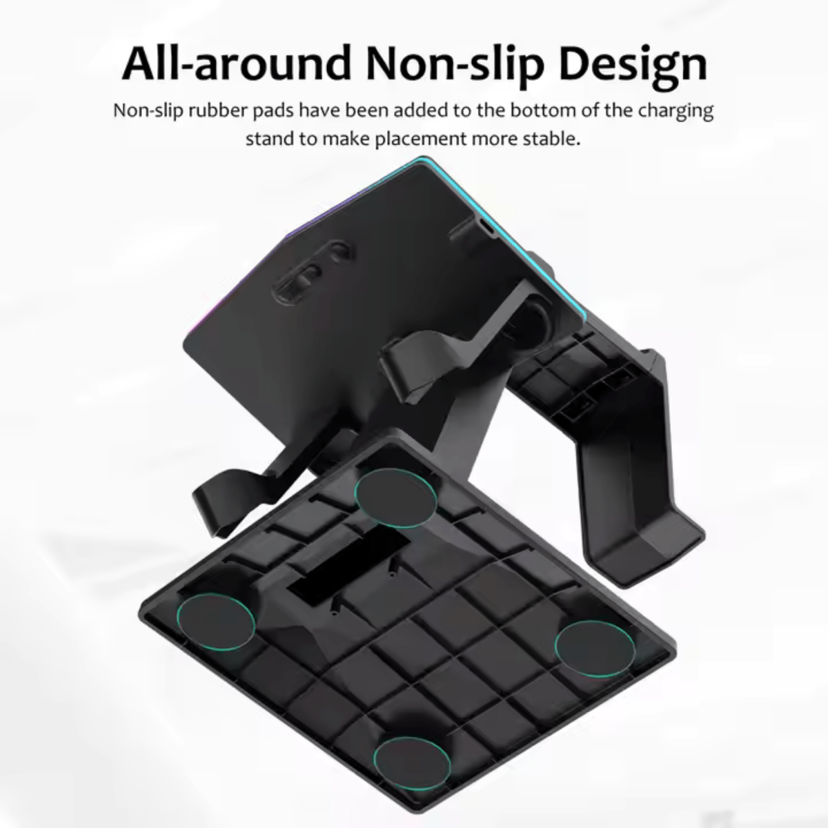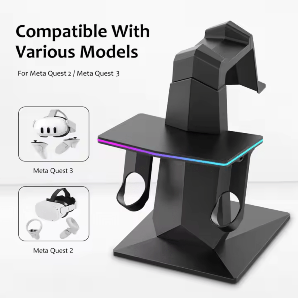 Gi stil og funksjonalitet til VR-riggen din med RGB-ladestativet, designet spesielt for Meta Quest 3S, Quest 3 og Quest 2-brillene.